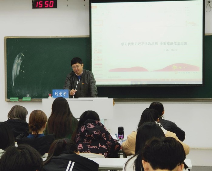 本次讲座从中央全面依法治国工作会议出发,重点围绕习近平法治思想和中国特色社会主义法治体系展开。刘宏宇首先以美国法学家伯尔曼的名言“法律必须被信仰,否则它将形同虚设”引入,将法治与信仰关联结合,为同学们具体阐释了习近平讲话中的“十一个坚持”,并通过生动的事例比较了中西方法治的不同,阐述了坚持中国特色社会主义法治的重要性和必要性。