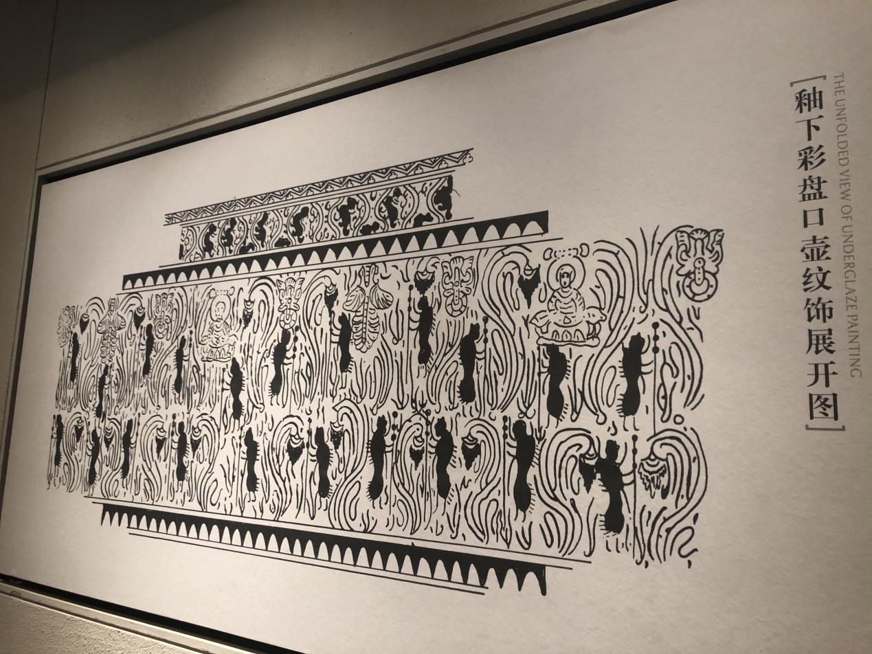 与青瓷莲花尊同为六朝博物馆镇馆之宝的还有东吴时期的“釉下彩羽人纹盘口壶”。这件器物描绘了羽人、仙草、比翼鸟、佛像等多种神异奇特的艺术形象。这件文物的釉下彩绘工艺改变了人们对釉下彩工艺始于唐代的认识,把中国釉下彩绘工艺出现的时间提前了近五百年。
