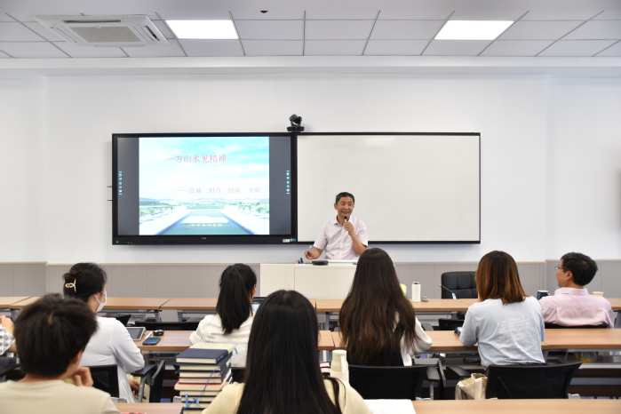 郭宏之向同学们介绍浦口校区的建设理念,深入阐述了浦口校区的建筑设计灵魂——“人,诗意的栖居”。他用经典诗句描绘校园里的每一个角落,指出南审校园聚散有序、动静有别、交往有利、四季有美、情思有归的匠心独具,概括出“一座校园,诗意为因;两所公司,依审而兴;三大理念,开拓创新;四方共建,铸魂润心;五大职能,不畏艰辛;六园同辉,广阔胸襟;七星拱月,道贯古今;八字校训,践行初心”的新校区场所精神,这一物化的实体空间铸就的场所精神将影响一代代学子,薪火相传。