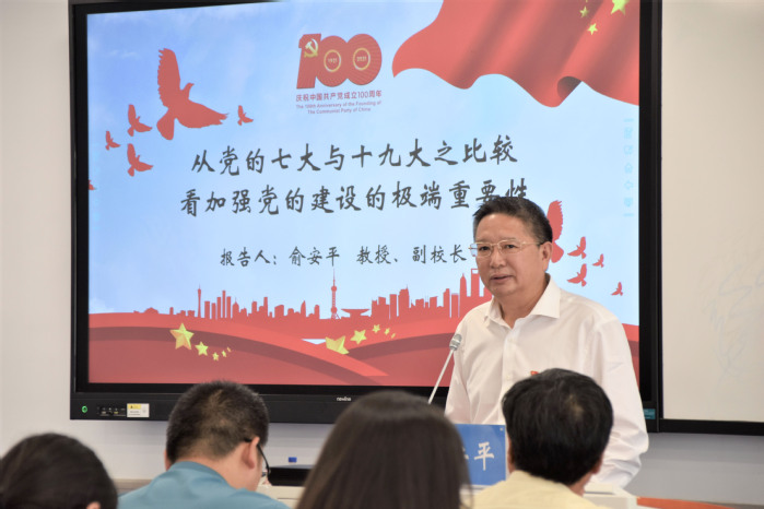 最后,俞安平通过七大为新中国奠基的历史意义,以及十九大精神在脱贫攻坚、抗击疫情中的贯彻落实,阐述了加强党的建设的极端重要性。他强调,坚持和加强党的全面领导,坚持党要管党、全面从严治党,要努力把党建设成为始终走在时代前列、人民衷心拥护、勇于自我革命、经得起各种风浪考验、朝气蓬勃的马克思主义执政党。