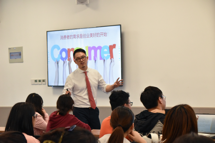 接着,周查理带领同学进行现场案例分析。IIA班陈景楠、李越同学针对“高端人才、高收入人群日常生活缺乏后勤保障”这一需求介绍小组创业创新项目情况,全体参会同学就顾客群体、价值主张等方面进行讨论。现场交流非常热烈。周查理鼓励两位同学当场向参会的同学们“销售”他们的创业想法。随着周查理对两位“创业者”的不断提问和交流,他渐渐地引入了“商业模式”的概念,引导同学们从更全面的角度考虑自己的创业项目。