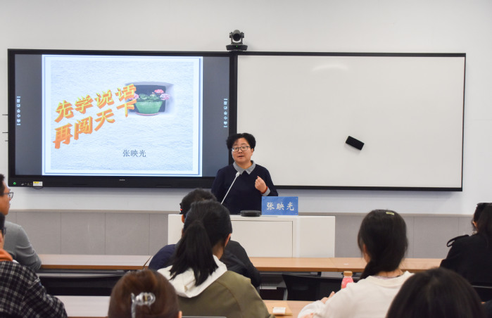 随后,张映光运用一系列启发性问题,说明了演讲与辩论的区别、演讲的几种类型等内容,为同学们之后的口才训练点明了方向。现场互动积极、气氛活跃。