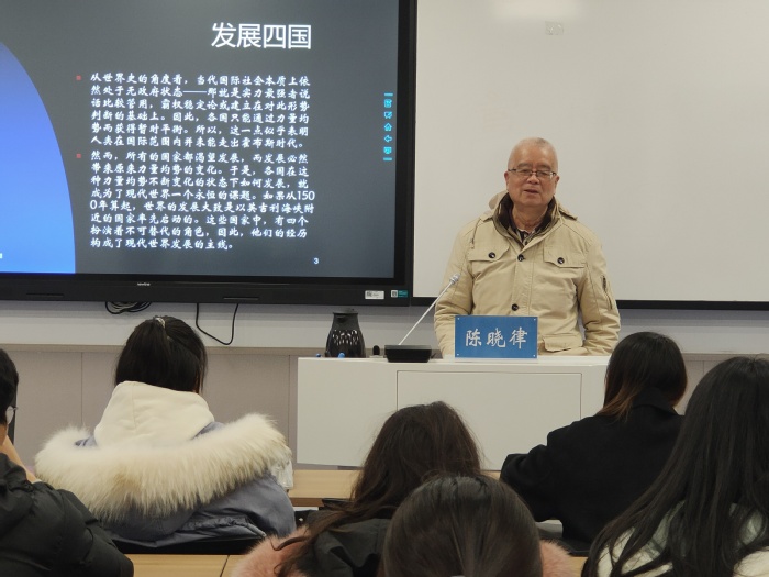 讲座由姜德波主持。他向同学们介绍了组织本次讲座的目的。他表示,为了培养同学们的全球视野和中国情怀,需要在纵向(历史)和横向(世界)的坐标中加强同学们对中国发展的理解和认识,本次讲座试图请陈晓律教授给同学们提供一个纵横交叉认识中国发展问题的分析框架。
