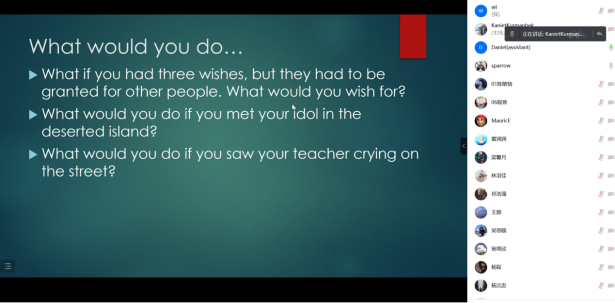During the process, someone feared that his English speaking skill wasn’t enough to show herself, Kaniet encouraged him and said: Our expressing desire comes from the heart, and the strength of English communication ability does not diminish this desire. That is to say, as long as we are willing to think, the process of saying it will certainly makes up to our exercise. Students benefited a lot from his words.