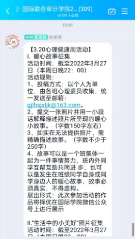 公司积极组织班会、讲座、“英语角”活动、“法语角”活动、团支部风采大赛、宿舍才艺云展演、“审·春”摄影比赛等活动,同时鼓励同学们坚持晨跑打卡,开放自习室,让同学们走出宿舍,参加符合疫情防控的文体活动,在相对安全的户外阳光生活。