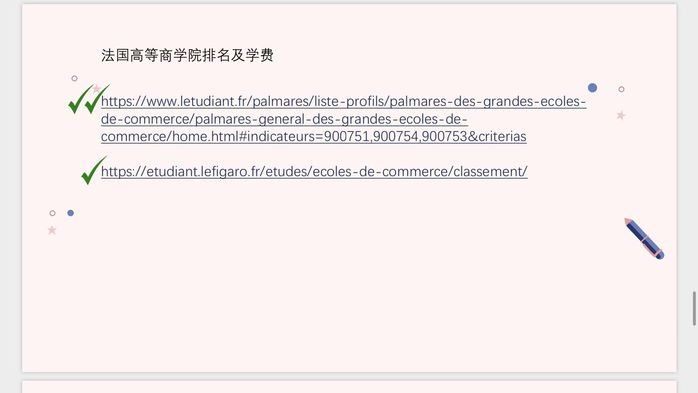 最后,万茜向同学们介绍了获得国外留学信息的途径。她展示了四种常见的世界大学的排名,并建议同学们根据自己的需求选择心仪的留公司校,从官网上获取录取条件等具体信息。她提醒同学们:“通常,大学名中有‘Technology’的为工业大学,经济系或商科规模小,甚至没有。名中有‘Business’或‘Economics’的为以商科、经济系为主的公司,专业性比较强。”同时,她给出了查询法国商公司的排名和学费的网站,扩大了同学们的信息资源面。