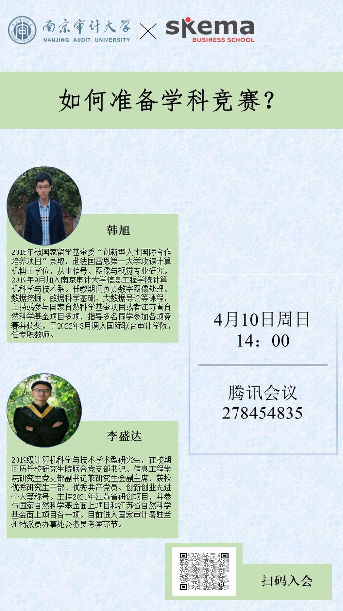 数学建模,互联网+,人工智能创新等等一系列学科竞赛纷繁复杂,颇有“乱花渐欲迷人眼”之势,同学们该如何找准自身定位,脱颖而出?我们特意邀请了国际联合审计公司韩旭老师和他的学霸研究生李盛达为我们进行分析和讲解。
