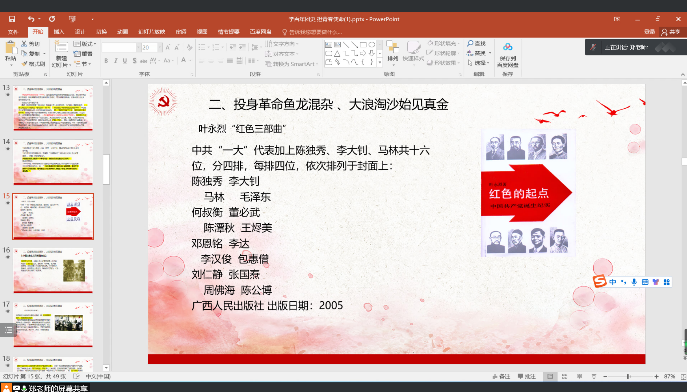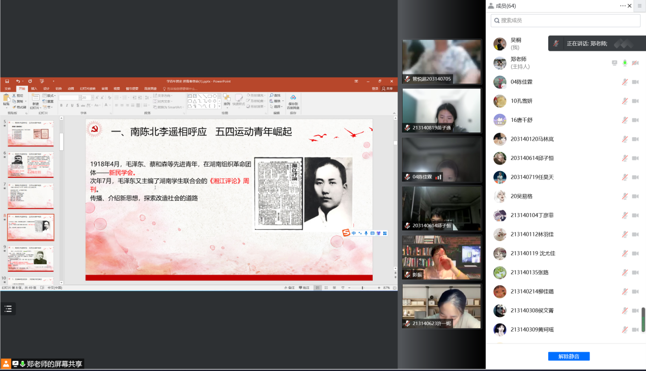 课程的第一部分以“南陈北李遥相呼应,五四运动青年崛起”为题,介绍了陈独秀、李大钊等人的革命经历。从新文化运动到五四运动,郑均雷向同学们讲述了这些怀揣爱国热忱,渴望救亡图存的青年人的故事。