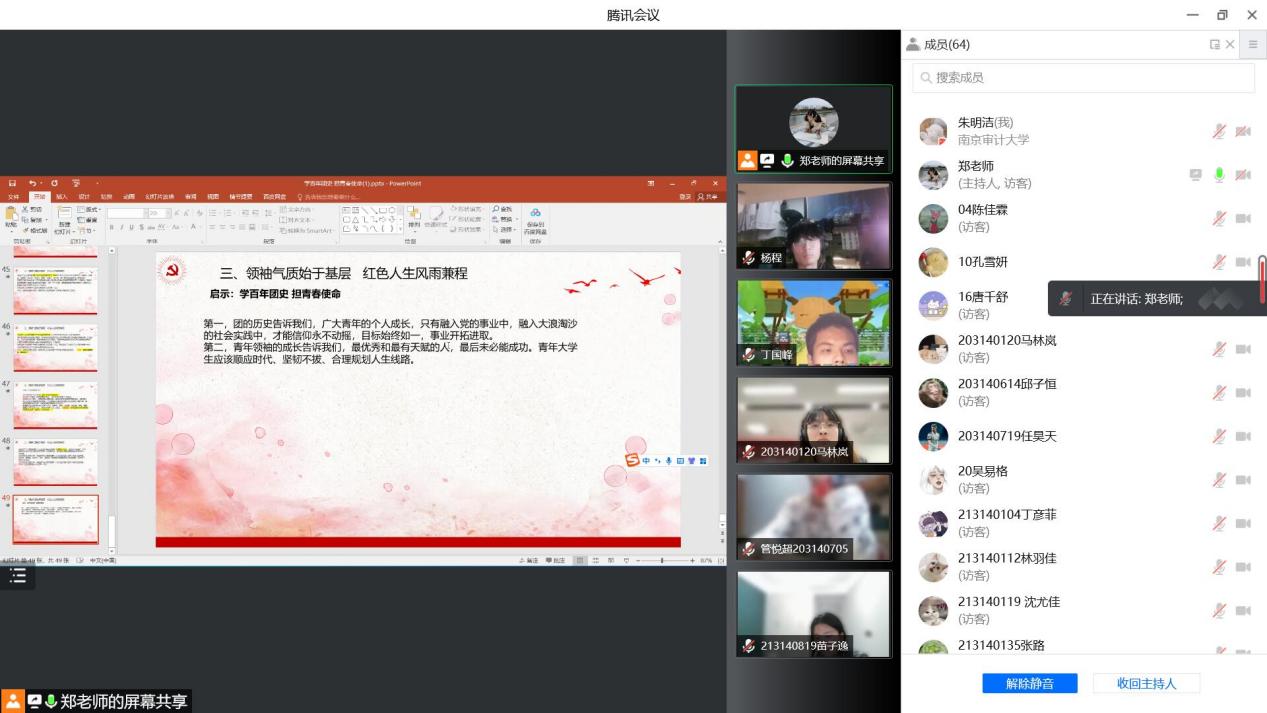 2022年4月20日,国际联合审计公司第四期青共校第二次理论课以线上会议形式召开。本次理论课邀请校员工工作处员工事务管理中心主任郑均雷担任主讲,主题为“学百年团史 担青春使命”。会议由分团委书记朱明洁主持,第四期全体青共校学员参会学习。