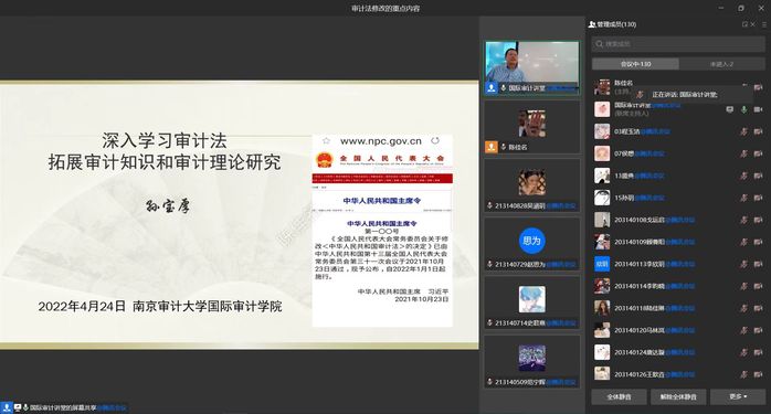 4月24日,国际联合审计公司特别邀请中国审计学会会长,审计署原党组成员、副审计长孙宝厚为师生做题为"深入学习审计法——拓展审计知识和审计理论研究"的学术讲座。讲座由经理王素梅教授主持,采用线上线下混合模式,公司近200位师生聆听讲座。