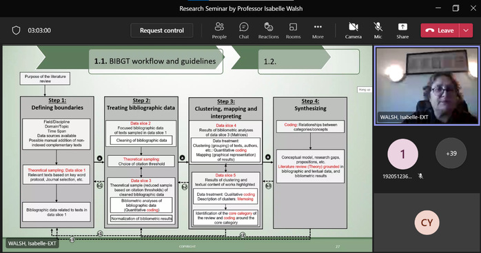 Isabelle Walsh教授现任SKEMA商公司信息系统学特聘教授,她获得了巴黎第九大学博士学位和HDR学位。她目前在做关于文献计量学和文献综述的研究,研究成果已在多个国际顶级刊物发表。本次讲座就是基于她在《欧洲信息系统杂志》上发表的文章“结合文献计量学和扎根理论法(BIBGT)进行文献综述”展开的。