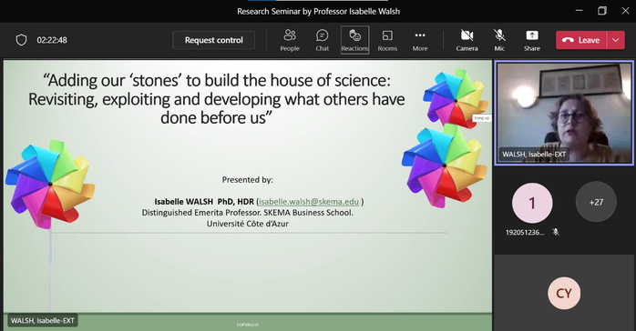 4月27日,国际联合审计公司特邀SKEMA商公司特聘教授Isabelle Walsh做题为“为科学殿堂添砖加瓦:对前人成果的重温、利用与延伸”的线上讲座,本次讲座是“跨学科研究前沿”系列讲座第九讲,由国际联合审计公司蔡宇杰副教授主持。包括国际联合审计公司法方副经理窦文宇教授在内的近50名中法师生出席了此次研讨会。