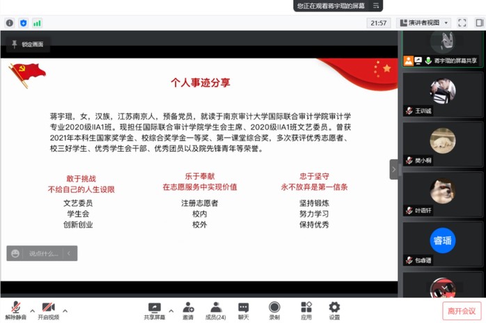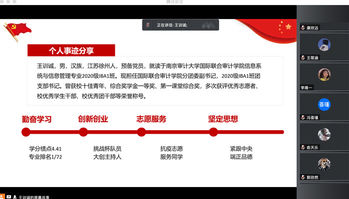 为迎接2022年“五四”青年节的到来,充分展现和发挥优秀青年的示范引领作用,4月26日至5月2日,国际联合审计公司“优秀青年事迹分享会”以线上线下结合的方式开展。10位优秀青年分别面向班团支部同学、寝室室友、员工干部等不同群体分享了自己在学习、员工工作、创新创业、志愿服务等方面的经验感悟,并与同学们交流体会,增进员工友谊,营造良好风气。