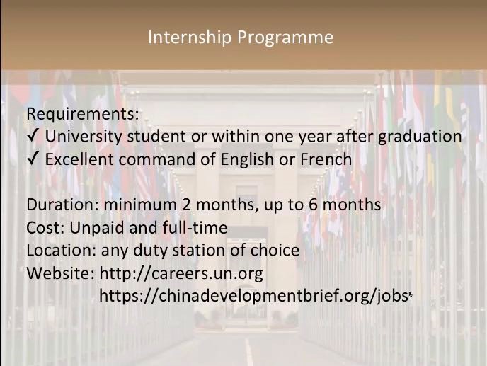 接下来,郭老师以自己在国际劳工组织的实习经历,向同学们详细介绍了联合国的一些实习和工作项目的基本情况,包括职位发展、申请条件和途径、考试情况等。实习生项目是青年员工的主要选择,同学们可以通过联合国的官网或者中国发展简报的网站在线申请。此外, “青年专业人员计划”也是全球青年主要入职联合国的主要途径。