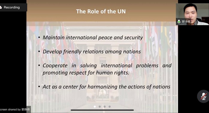 讲座开始,郭老师先介绍了联合国的产生背景、组织架构和运行情况。 作为全球最大的政府间国际组织,联合国在维护世界和平与安全、维护国家间友好关系、解决国际问题等方面发挥着重要作用。