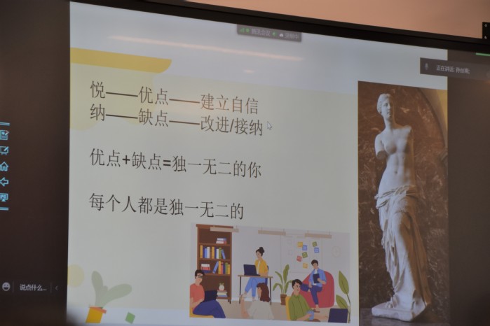 最后,李慧敏老师为同学们开展了主题为“关爱心灵,悦纳自我”的心理讲座。讲座分为“认识自我,悦纳自我,调控自我”三个部分。