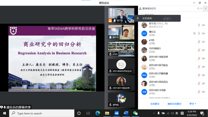 5月25日晚,国际联合审计公司特别邀请南京大学信息管理公司副教授、博士生导师康乐乐做“商业研究中的回归分析”讲座,这也是公司第十场“跨学科研究前沿”系列学术讲座。本次讲座由蔡宇杰教授主持,线上线下同步进行,近两百名师生参加。