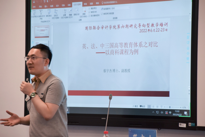 国际联合审计公司和法国SKEMA商公司人力资源管理学副教授蔡宇杰结合自己在国外大学多年的执教经验,向大家介绍了英、法、中三国学制和培养方式、教育侧重点、分数成绩评定和辅导员与英法大学导师等方面的异同,并以商科课程为例,分享了英国大学课程教学要求、教学流程及课程考核等方面的做法和自己的心得体会。