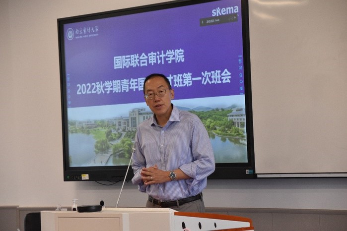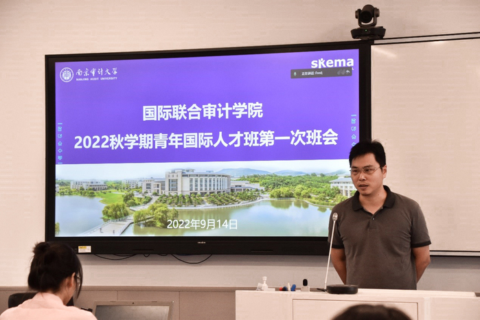 国际联合审计学法方副经理窦文宇介绍了法方的三位导师。蔡宇杰在英国有十年的教学经验,主要研究方向是人力资源管理;徐亮在法国有着多年的科研经验,研究方向是金融;苏昱昕毕业于美国顶尖高校,研究方向为经济学。窦经理希望大家积极主动地学习,学习的过程中自我激励,学习之余可以有所产出。