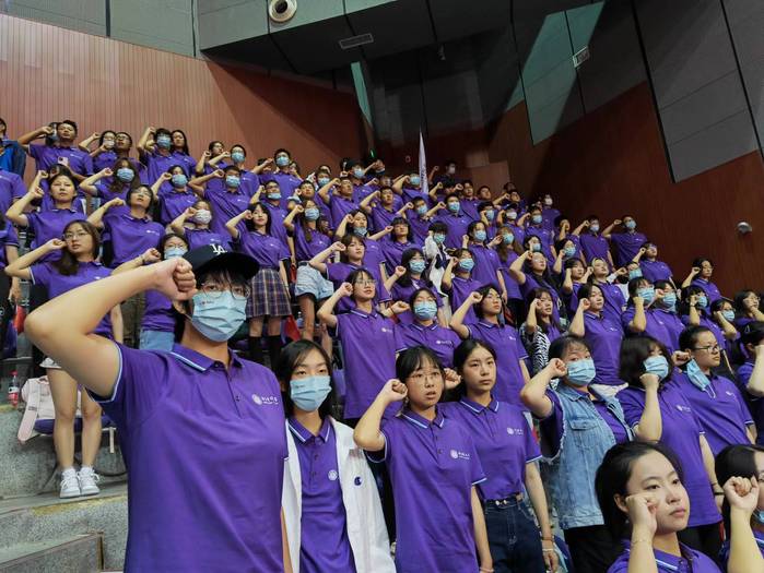 在新生代表的带领下,全体新生庄严宣誓。“用青春的风采扮靓今天的母校,用优秀的成绩贡献祖国的明天!”