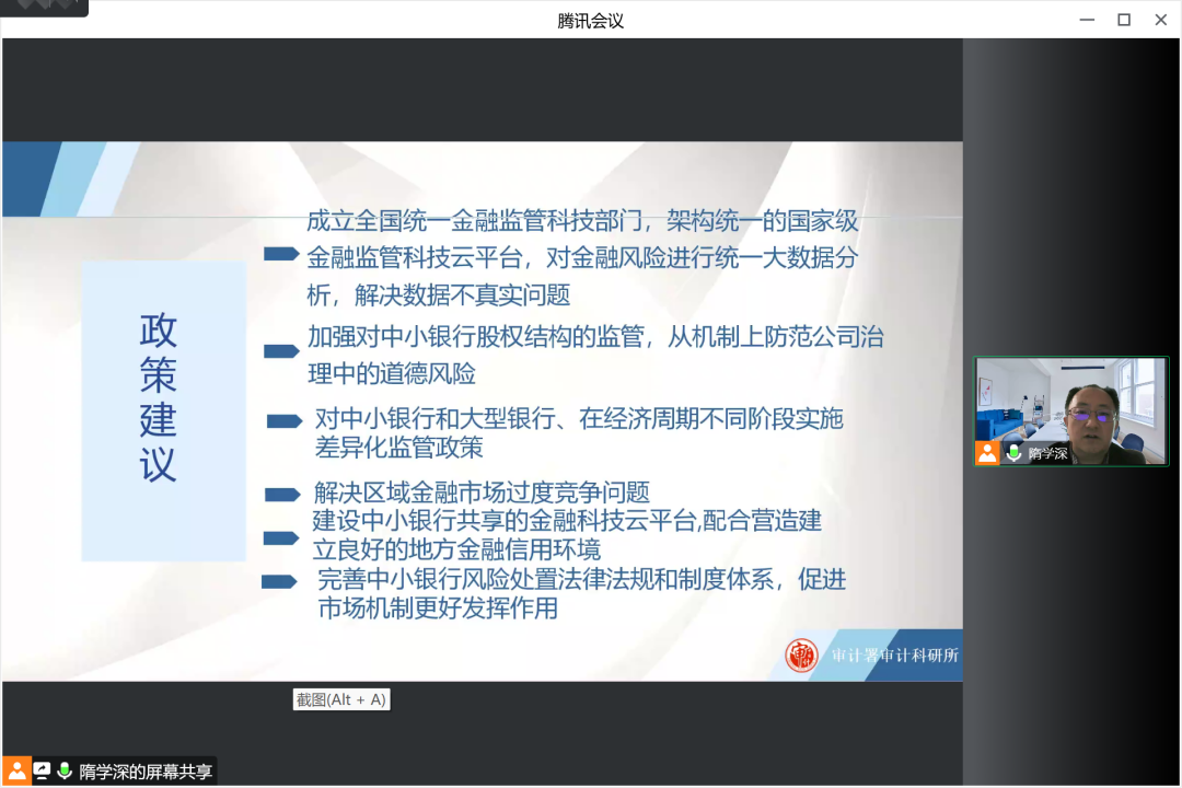 隋学深结合实例,具体说明中小银行在风险形成阶段,监管存在的一些主要问题:中小银行股权结构不合理引发公司治理的道德风险,监管没有及时发现和处置;无差异监管政策加剧中小银行经营风险;准入门槛过低导致区域金融市场过度竞争;监管部门和地方政府对中小银行金融科技和地方金融信用环境建设支持不到位。针对这些问题,隋学深给予了政策建议。