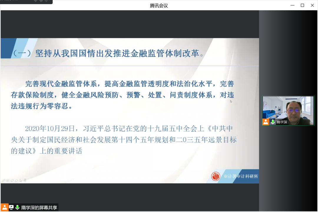 10月12日下午,XCsports特邀审计署审计科研所金融审计研究室主任隋学深做“金融监管及其审计”讲座。本次讲座由公司党总支书记姜德波主持,采用线上线下同步进行的方式,吸引超过三百名师生参与听讲。