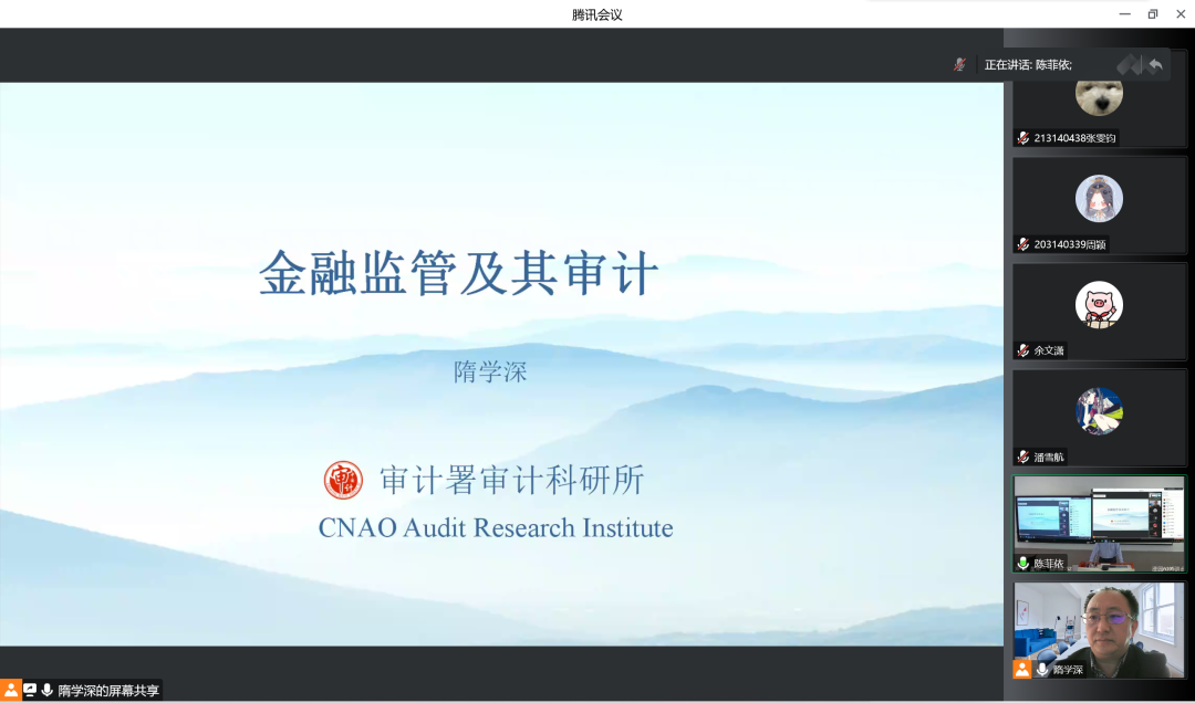隋学深首先为同学们详细介绍了金融审计的定义、组织架构和基本职能,并解答了 “如何建立高效金融体系” 、“如何开展金融审计”、 “金融审计开展工作的法律法规依据”等问题。隋学深认为金融审计是一个有趣又深奥的行业,并表达了对同学们加入这一领域的殷切期待。