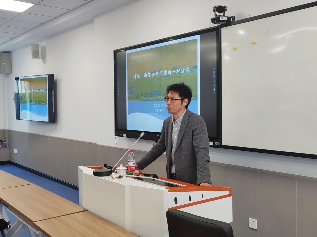 洪涛长期从事文学概论、中国古典文学史等课程的教学,对古典文化有着深厚的造诣。本次讲座,洪涛从人们对诗歌的看法影响、诗歌的重要性以及对中国诗歌的思考三个方面出发,向同学们介绍了如何通过诗歌来读懂古典中国。