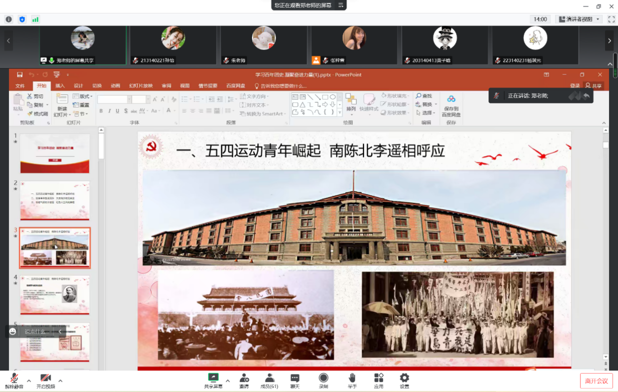 郑均雷以五四运动的重要活动地点之一——北京大学红楼开篇,引出了五四运动的发展过程以及爱国、进步、民主、科学的伟大五四精神。他着重介绍了李大钊、陈独秀等代表人物,强调了他们对中国社会思想、组织等方面的重大贡献。他指出,新时代青年也应用实际行动践行“五四精神”,做朝气蓬勃、迎难而上的好青年。