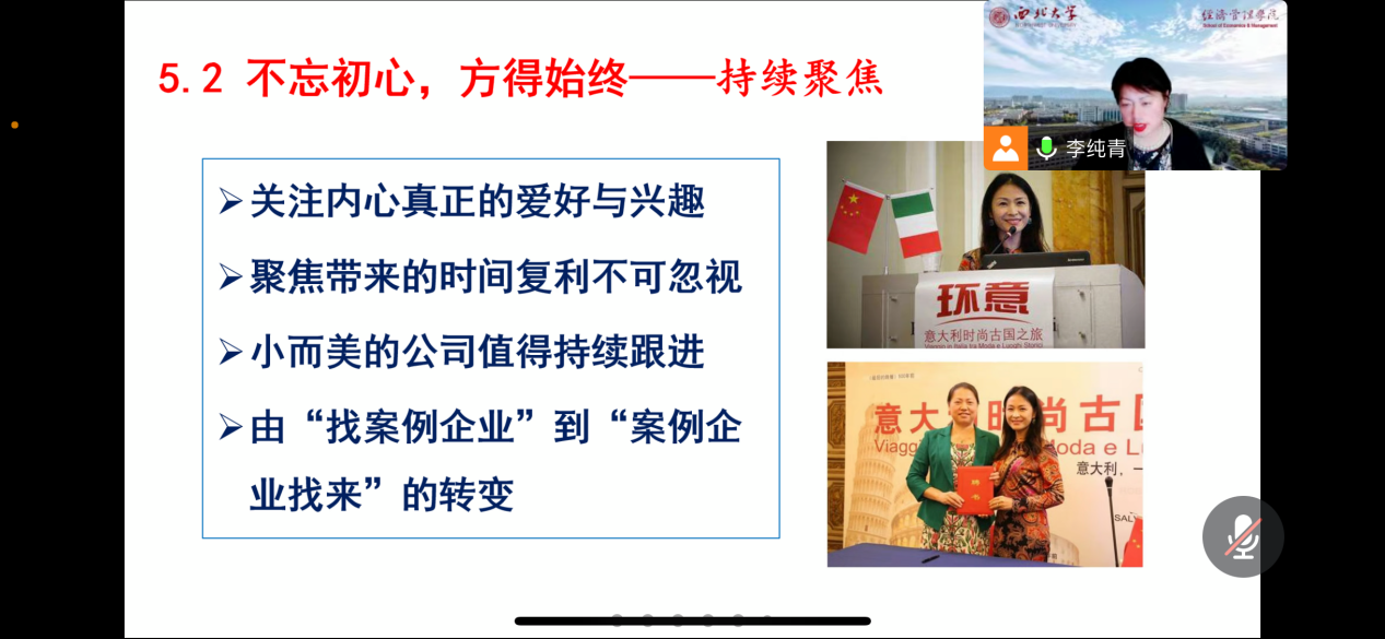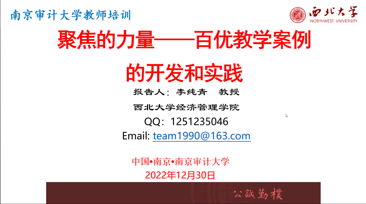 西北大学经济管理公司李纯青教授结合自己多年开发教学案例的丰富实战经验,向大家做了主题为“聚焦的力量——百优教学案例的开发与实践”讲座。她强调了选题对于优秀教学案例的重要性,介绍了在案例中寻找知识点的方法,并分享了以光伏、旅行社等公司为例的项目跟进做法和自身心得体会。