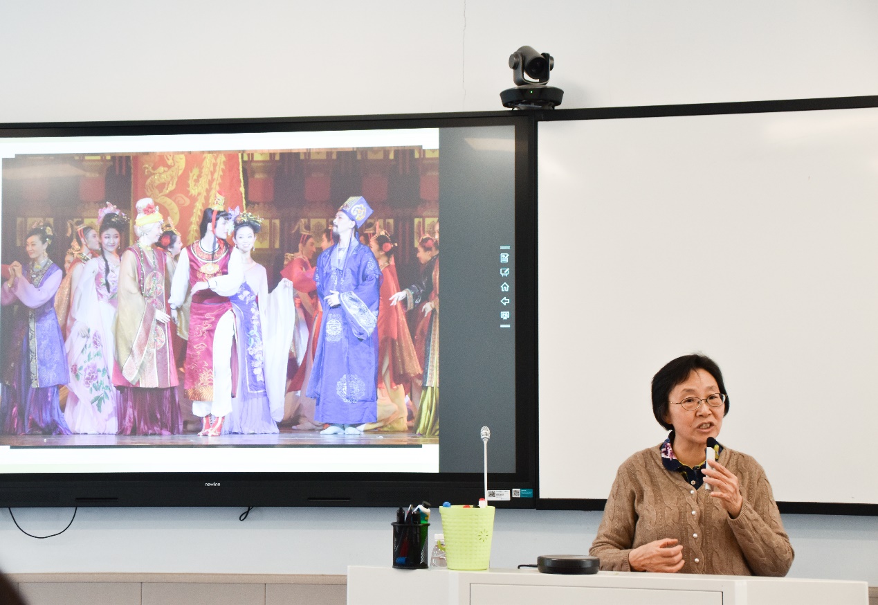 韩希明以红楼梦中的绚丽的色彩为切入点,生动的剖析了蕴藏在红楼梦中的那充满历史气息的色彩。她向同学们讲述了“米汤娇”,“莺儿”、“胭脂”、“紫绛”、“柳黄”等传统色彩的搭配表现,指出这些色彩搭配的灵感都是从大自然中取来。通过不同的人物搭配不同颜色的衣物配饰,可以探出红楼梦中的不同人物的性格特征所对应的不同色彩,而这些丰富绮丽的色彩是更一步很好的彰显放大人物的性格特征。“很轻的银红色软烟罗”、“大红的须是黑络子”等人物对一些饰物颜色的搭配,更是加深读者对小说剧情和人物性格特点的深刻理解。韩希明还和同学们探讨了“贾宝玉的玉究竟是什么颜色的”等趣味话题,挖掘《红楼梦》中一些隐藏的小故事。