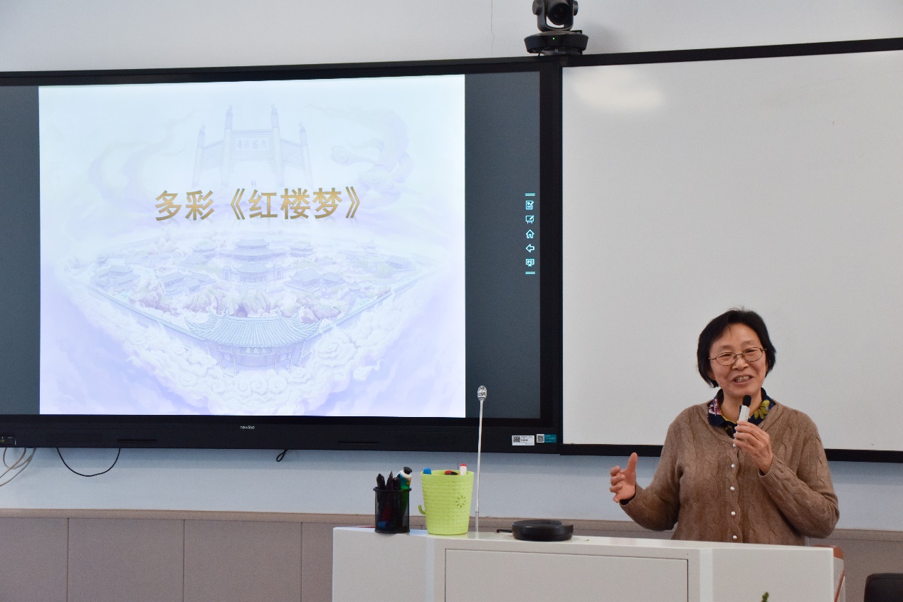 韩希明以红楼梦中的绚丽的色彩为切入点,生动的剖析了蕴藏在红楼梦中的那充满历史气息的色彩。她向同学们讲述了“米汤娇”,“莺儿”、“胭脂”、“紫绛”、“柳黄”等传统色彩的搭配表现,指出这些色彩搭配的灵感都是从大自然中取来。通过不同的人物搭配不同颜色的衣物配饰,可以探出红楼梦中的不同人物的性格特征所对应的不同色彩,而这些丰富绮丽的色彩是更一步很好的彰显放大人物的性格特征。“很轻的银红色软烟罗”、“大红的须是黑络子”等人物对一些饰物颜色的搭配,更是加深读者对小说剧情和人物性格特点的深刻理解。韩希明还和同学们探讨了“贾宝玉的玉究竟是什么颜色的”等趣味话题,挖掘《红楼梦》中一些隐藏的小故事。