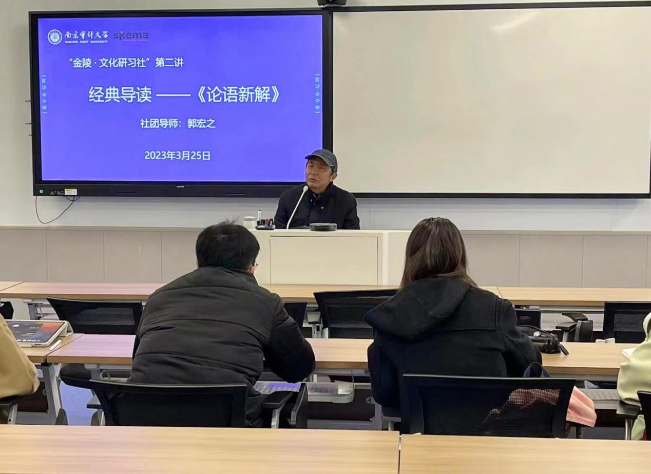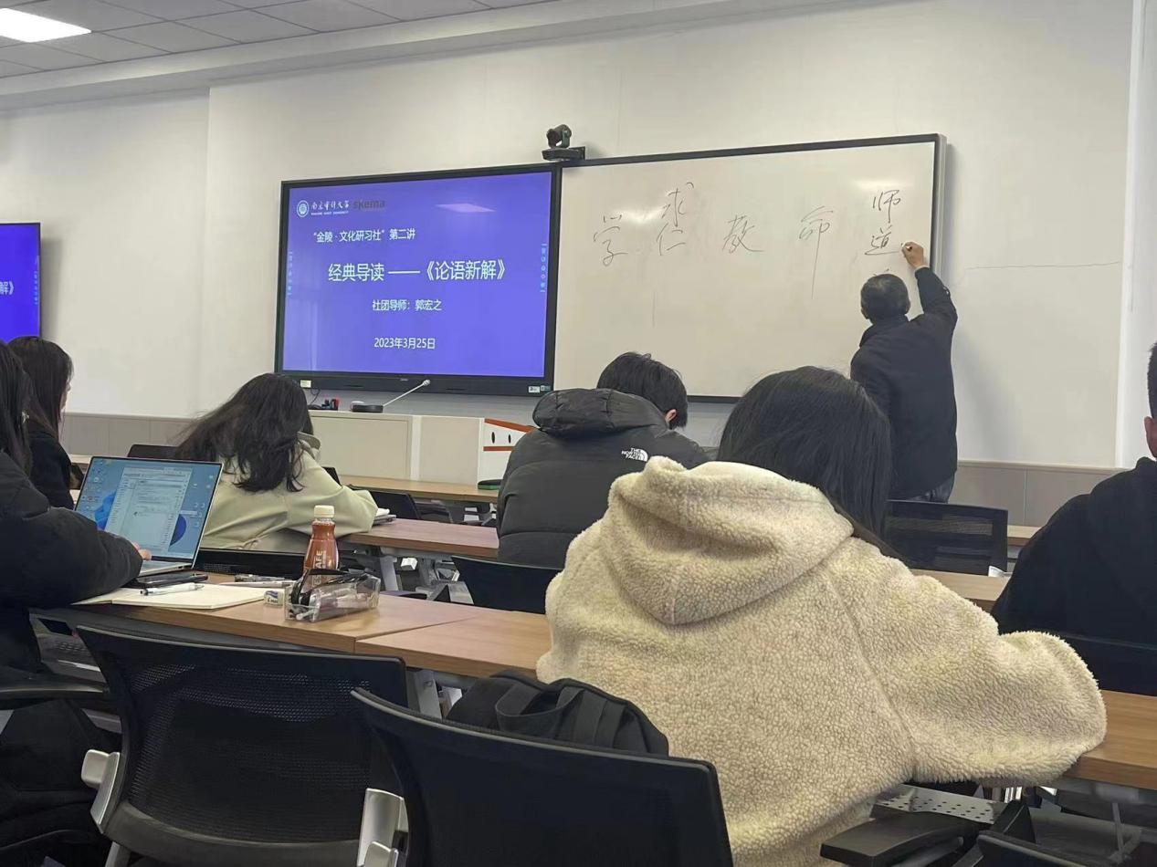 郭宏之开篇讨论为什么要学习论语。党的二十大报告指出:要坚持文化自信自强,坚持和发展马克思主义,必须将马克思主义基本原理与中国具体实践相结合,与中华优秀传统文化相结合。因此,当代老员工就一定要学习中国优秀传统文化。优秀传统文化早已浸入我们的骨髓,是人民群众日用而不觉的经典,流淌在每位中国人的血液中。郭宏之谈及润泽湖名字《礼记》的“温润而泽,仁也;瑕不掩瑜,忠也”。润泽湖在一届届南审学子中口口相传,在潜移默化中提升学子们对传统文化的热爱。他教诲员工要“问渠那得清如许,为有源头活水来”,只有不断学习,同学们才得以找到精神活水,达到“天光云影共徘徊”的境界,实现主客观世界的相互激发,相互融合。