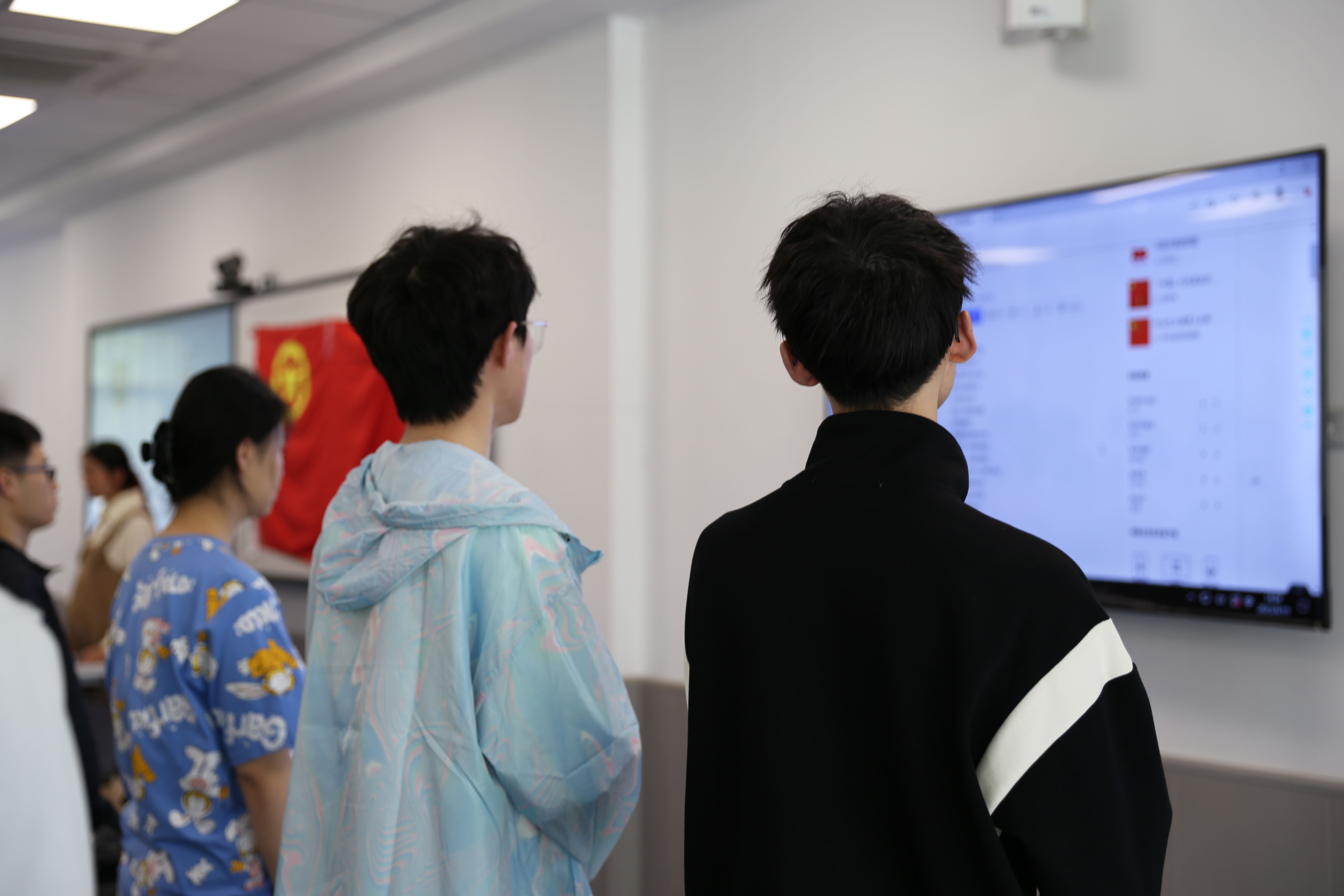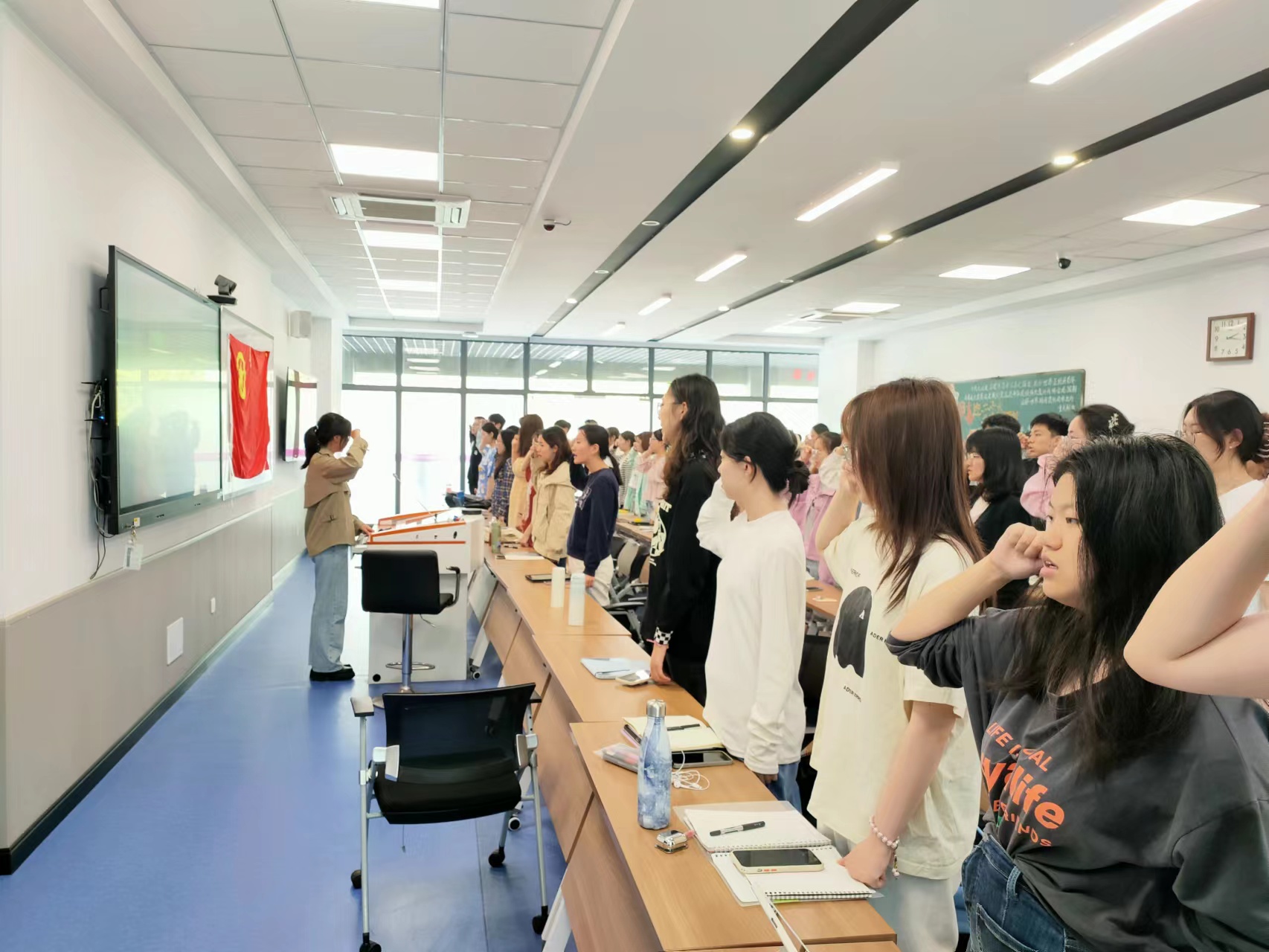 同学们面向鲜艳的团旗,信念坚定,满怀希望,共同唱响中国共青团团歌《光荣啊!中国共青团》。
