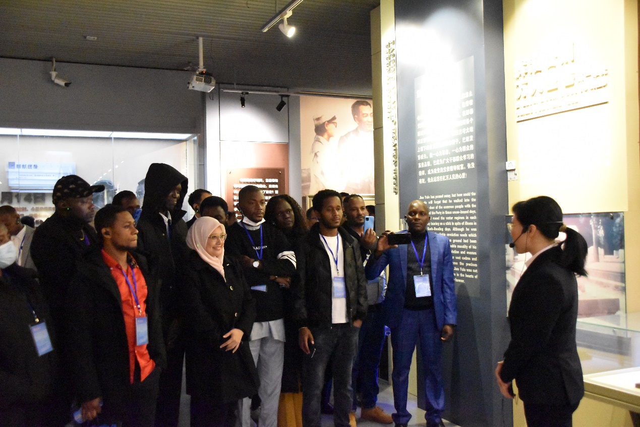 随后,来华职工参观了兰考县展览馆。在这里,他们了解到兰考悠久的历史及风俗文化。一幅幅撞击心灵的图片,一桩桩感人的故事,仿佛将学员们带回到县委书记的榜样——焦裕禄带领兰考人民治理风沙、盐碱、内涝等“三害”、战天斗地的年代。一幅幅图片生动展示了以焦裕禄为代表的中国共产党人全心全意为人民服务的伟大事迹。大家驻足观看,认真聆听,在共同追忆焦裕禄同志的生平事迹中,在回顾焦裕禄同志“亲民爱民、艰苦奋斗、科学求实、迎难而上、无私奉献”的光辉历程中,更加深刻地理解了焦裕禄精神的实质和内涵。