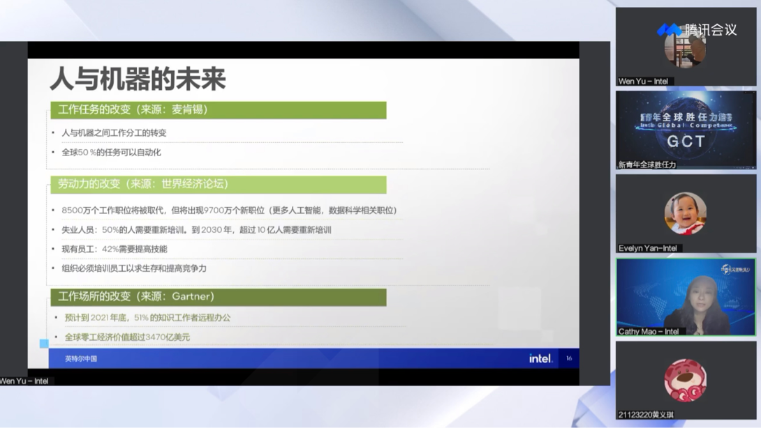 随后,毛琴着重强调了人与机器的未来发展趋势。她认为,随着科技的进步,机器将会承担大量的人类工作,旧的工作职位将被人工智能所代替,人类的部分能力,例如手工能力,认知能力和情感能力会因此而退化,但同时也会产生新的职位需求,所以员工必须经过培训来增强职场竞争力。另外,科技的进步也会带来工作场所的改变,一半的知识工作者将会实现远程办公。总的来说,青年老员工应该拥抱科技,拥抱变化,不断探索,勇于自我迭代。