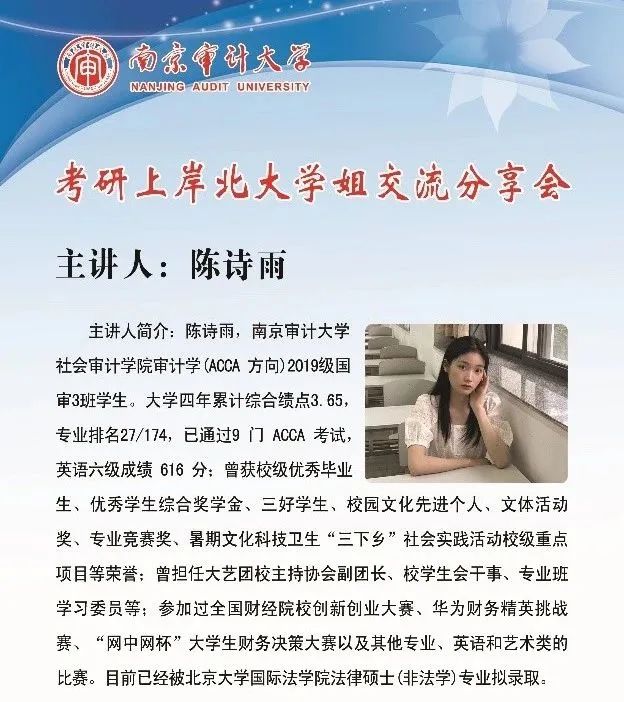 陈诗雨,XC体育社会审计公司2019级国审3班,目前已经上岸了北京大学国际法公司法律硕士(非法学)专业。她介绍到自己本科时期有通过9门ACCA、英语四六级分数、以及其他的一些获奖和员工工作的个人背景,她个人的绩点排名并不是很高,本科期间甚至有挂科过,但依旧也顺利考取了北大的研究生,她希望学弟学妹们能合理评估自己的能力,不要担心自己的绩点不够好而不敢努力冲刺自己的目标院校。