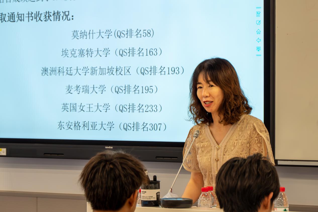 副经理(主持)张文秀向同学们介绍了首届员工的升学情况。她提出,同学们要提前做好规划,思考未来的发展方向,了解不同国家的教育特点,努力学习,打好基础。她希望同学们都能够成人成才,成为闪亮的自己。