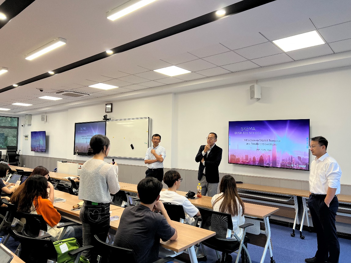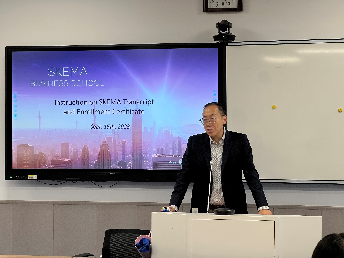 窦文宇展示了法国Skema商公司成绩单及在读证明,讲解了法方成绩构成与申请材料获取方式,为员工材料准备提供多样、便利的途径。