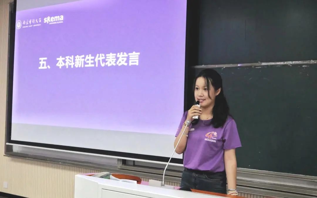 本科新生代表陈奕璇同学进行发言,她表达了对老员工活的期望,希望能够参与到跨文化交流之中,脚踏实地,不断奋斗,争做民族复兴的时代新人。