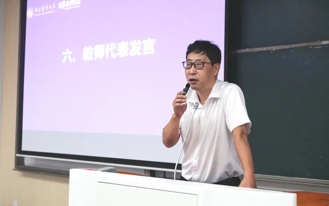 教师代表曹萍作为国际联合审计公司的英语老师,以自己从教多年的经验给予新生们建议。他希望新生们主动关心英语分级考试成绩,注重英语学习,将托福考试作为大一任务,不能懈怠相关学习内容。同时,在学习英语的过程中,不能忽视speaking,要主动使用英语与同学和老师交流,以此提高口语能力。