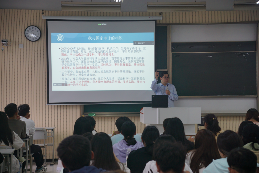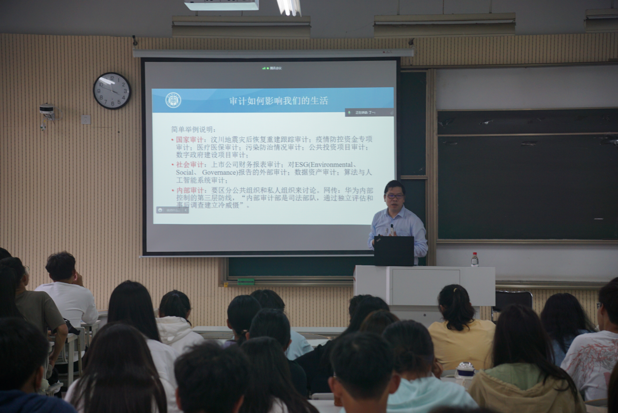 随后,廖飞从多个维度向同学们讲述了审计对我们生活的影响。他指出,审计的制约作用有助于各种经济责任的正确履行和社会经济的健康发展,其促进作用有助于国民经济管理水平和绩效的提高。此外,审计思维还有助于帮助我们更好地预测风险、规避风险,以保证经济行为不偏离应有的轨道,保障经济社会稳健发展。