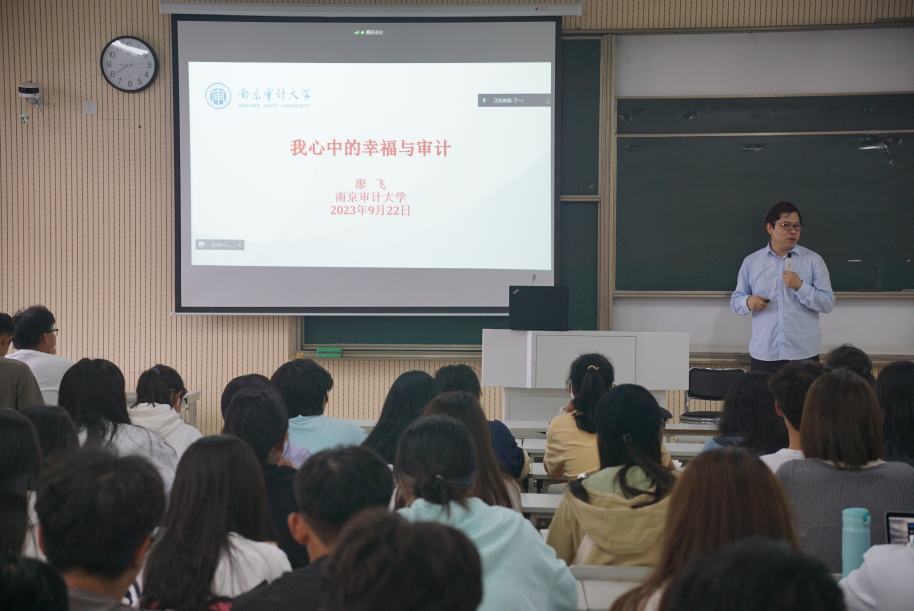 9月22日下午,我院在致远楼401教室为2023级新生开展专业教育讲座,402教室同步线上直播。本次讲座由XC体育政府审计公司审计学系教师廖飞副教授为同学们做题为“我心中的幸福与审计”的专题报告。