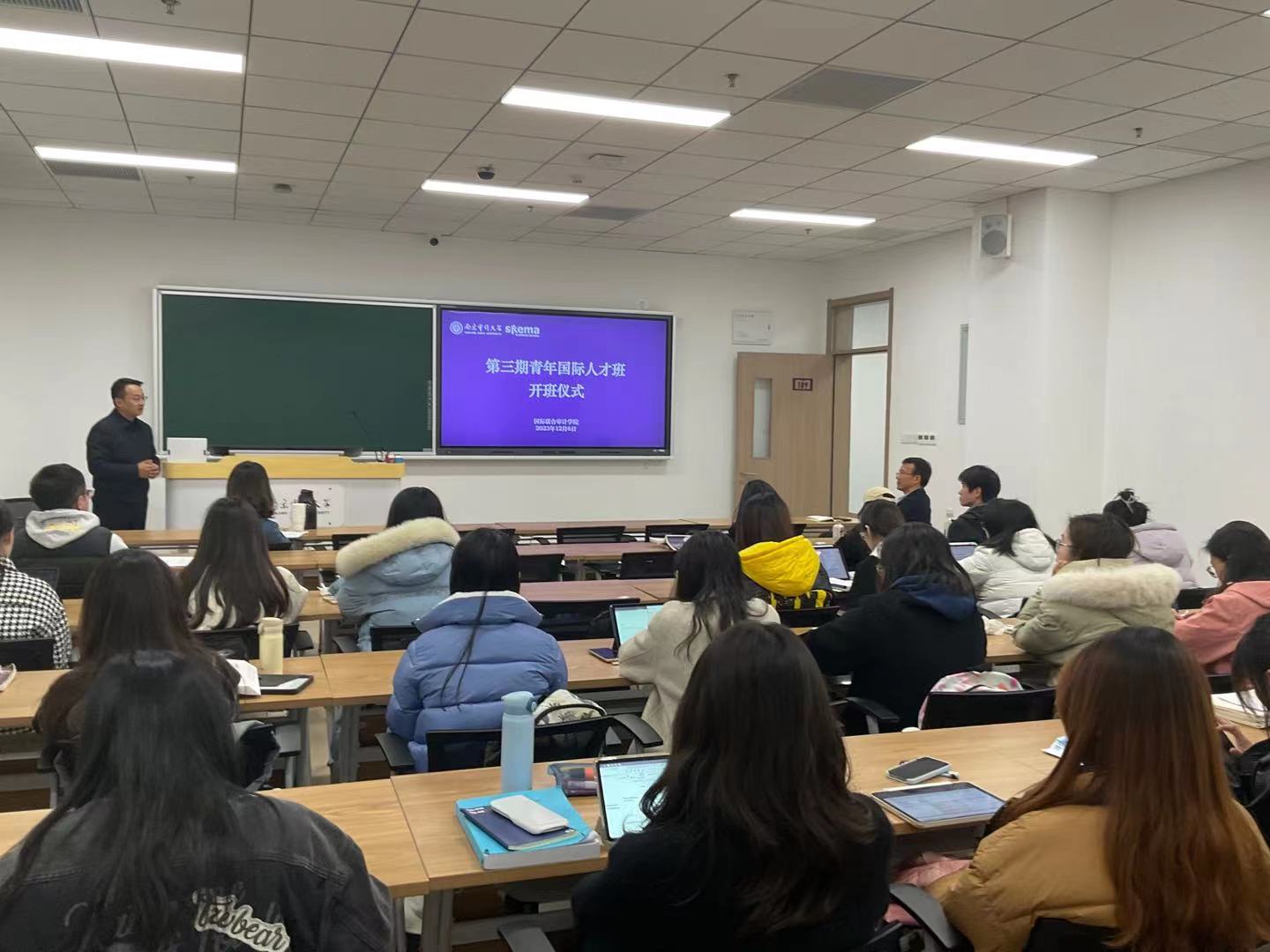 江振春致辞并发表讲话。首先,他祝贺与会同学成为青年国际人才班的一员。他鼓励班内同学与来自不同国家的外国职工们积极交流,参与到中法文化周中的文体活动,展现人才班同学青春风采。最后,他殷切希望人才班的同学们能够在与联合国等国际组织的交流中发光发热,成为中外友好交流的桥梁。