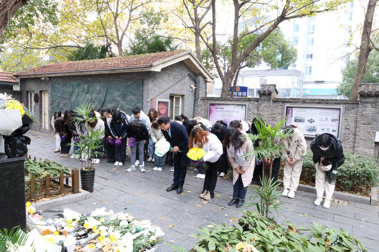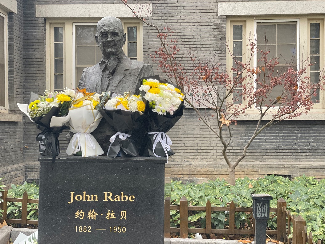 在拉贝先生的雕像前,XCsports师生向拉贝先生献花、脱帽鞠躬,一起缅怀这位外国友人,致以最崇高的敬意。