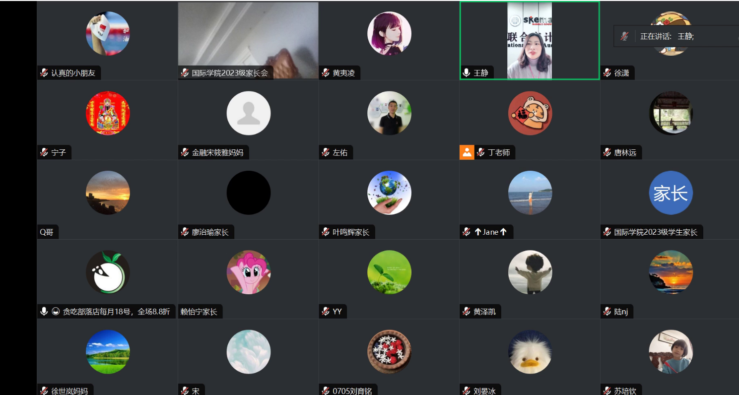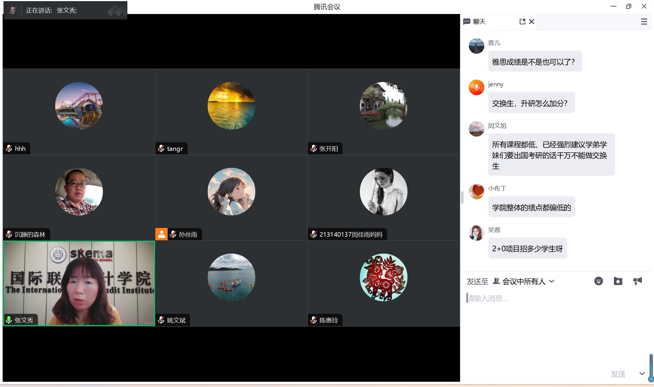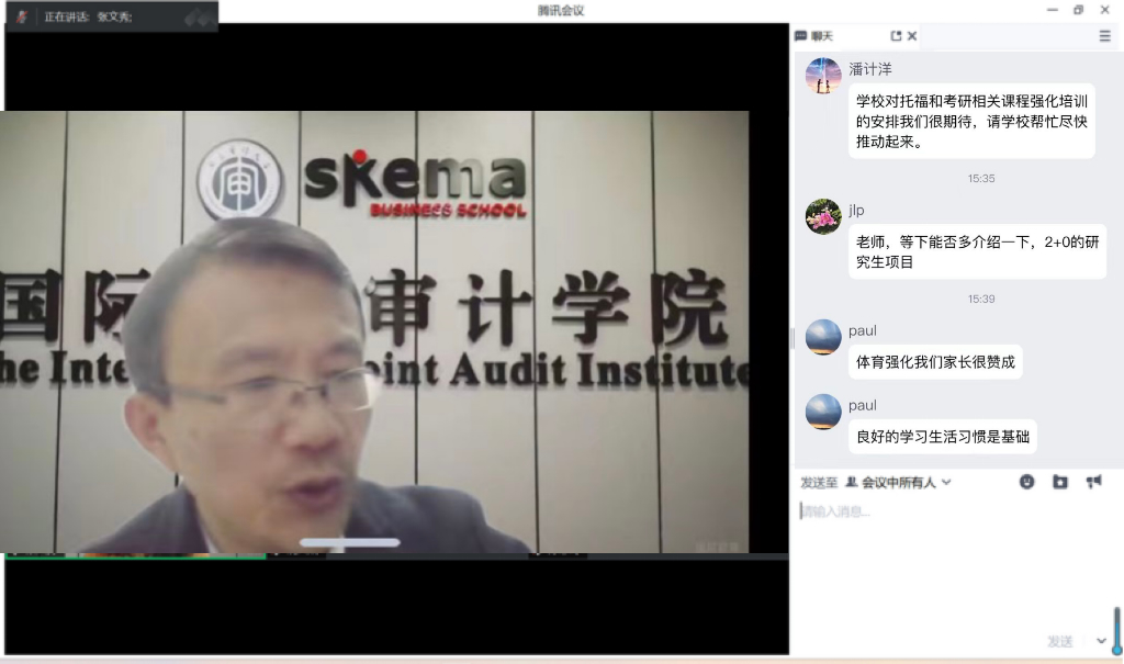 张文秀从公司的办学质量、教学改革、国际交流、人才培养计划特色等方面向家长介绍了公司2023年取得的成效及未来的机遇,并对公司“2+0”中法合作硕士研究生项目作出特别说明,她希望同学们利用假期完成托福考试,充分用好公司的优势特色,国内、国外升学“两条腿”同时走,充分利用SKAME商公司全球校区的学术资源和社会资源,积极争取到海外交换、游学的机会,拓宽国际视野。