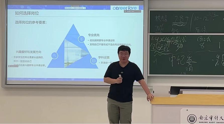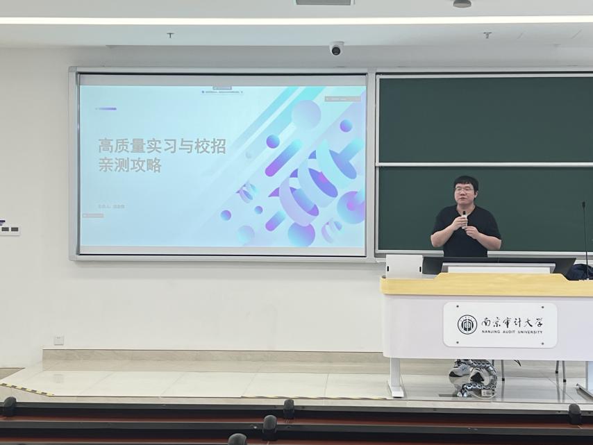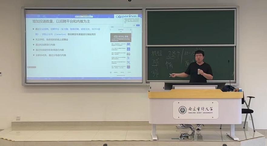 然后,吴老师就如何选择企业和岗位展开了分析。首先他认为选择企业是决定实习、工作经历是否成功的重要因素之一。在选择企业时讲究“知己知彼”,可以通过网上查询、询问员工以及面试实地感受等方面来筛选企业。在选择岗位方面,他结合南审近两年的升学就业趋势,分析了“专业转码”的现象,进一步强调了岗位选择兴趣优先、专业优先的重要性。