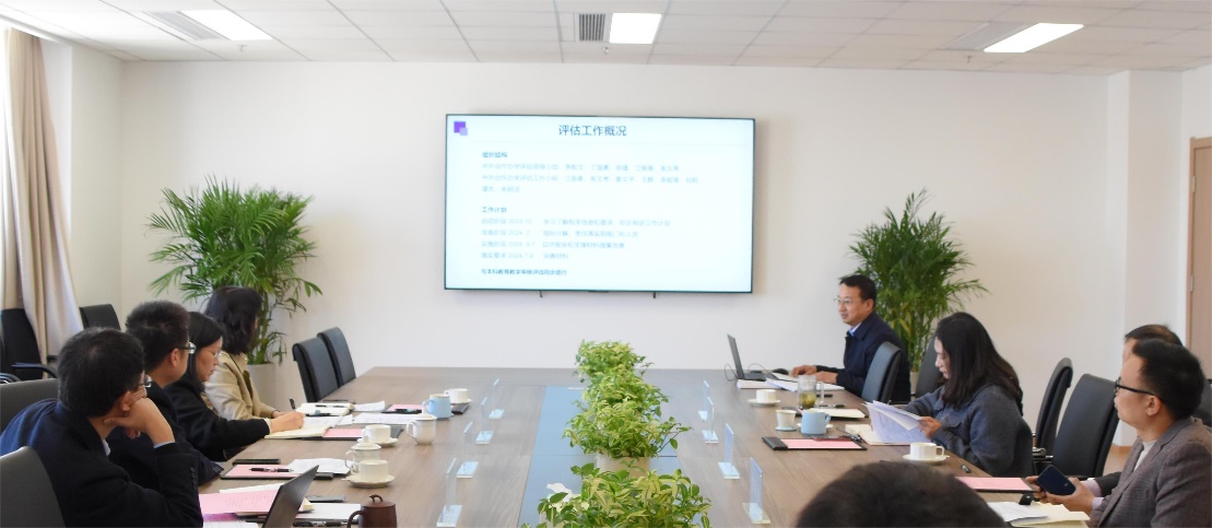 教学评估处副处长(主持)陈婕介绍了公司评估工作的组织架构、进程安排和工作要求。她总结了三个关键词:公司产品、规范及质量,希望公司在评估工作中凝练出系统性总结,形成宝贵经验推广到全校。她分享了公司前期评估积累的经验,表示将大力支持国际联合审计公司各项评估工作。