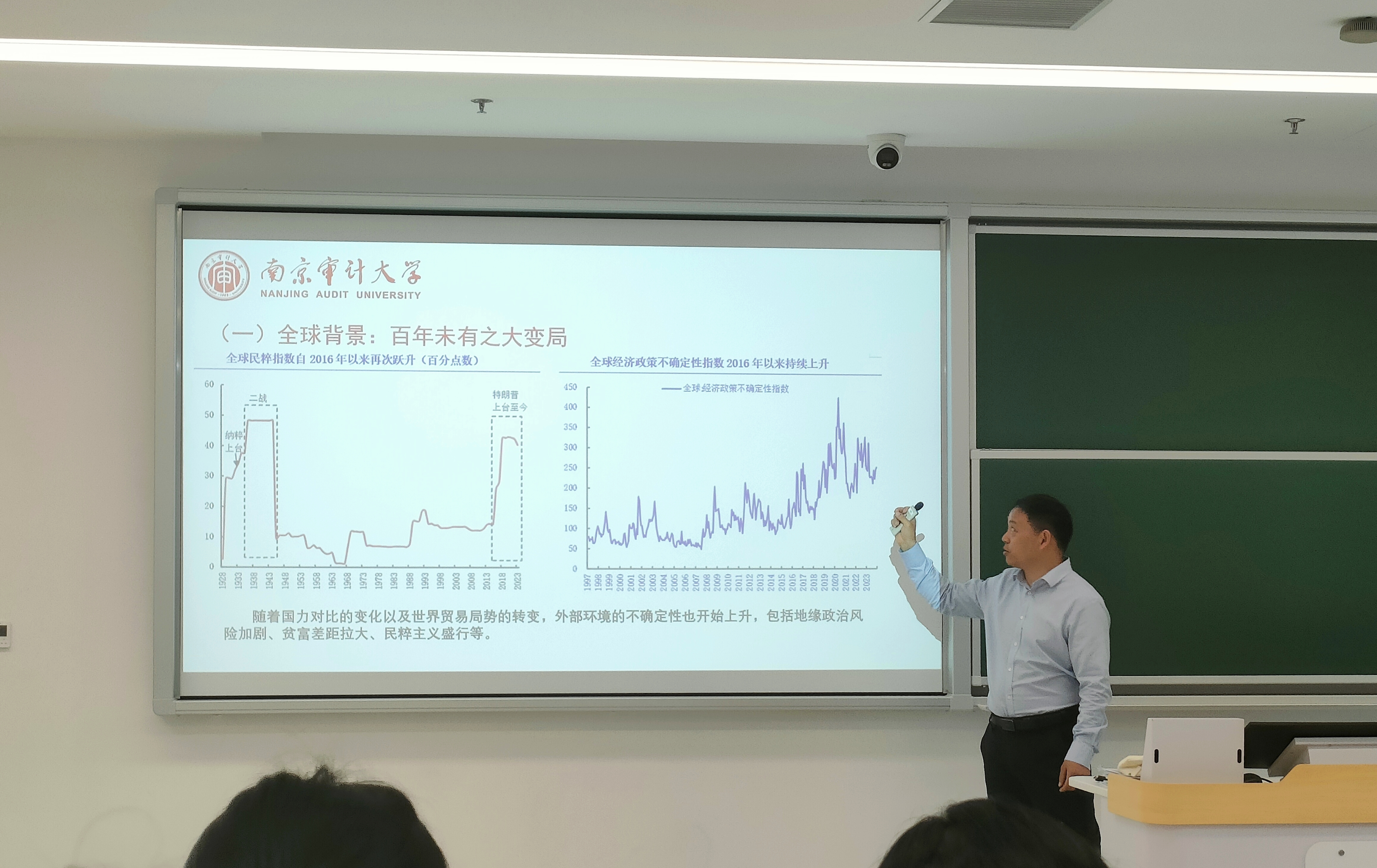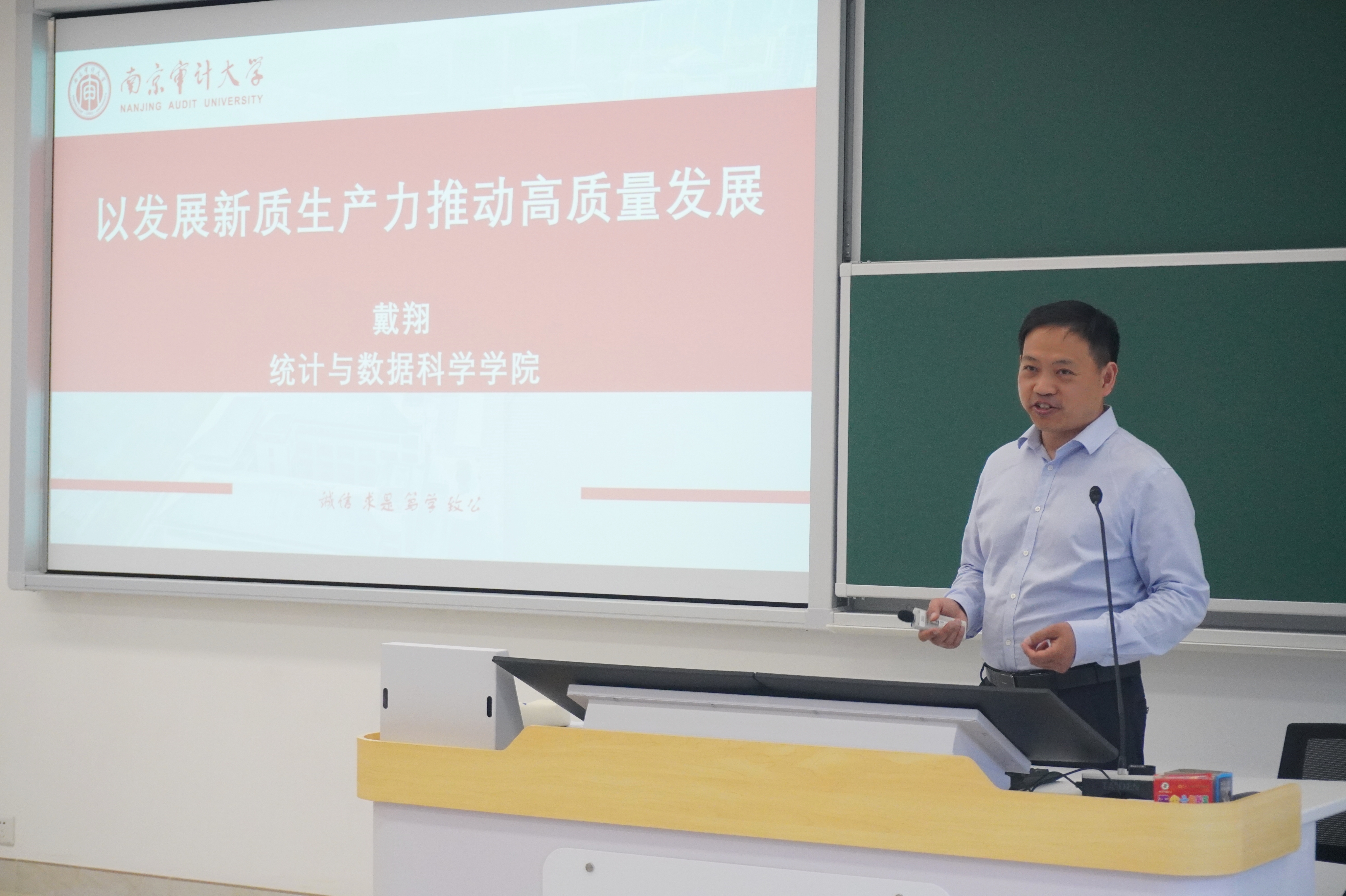 5月22日下午,党校、青共校和团校全体学员在综合楼207教室开展第四次理论课学习,主题为“以发展新质生产力推动高质量发展”。本次理论课特邀XC体育统计与数据科学公司的博士生导师戴翔教授授课,XCsports副书记、副经理王静主持讲座。
