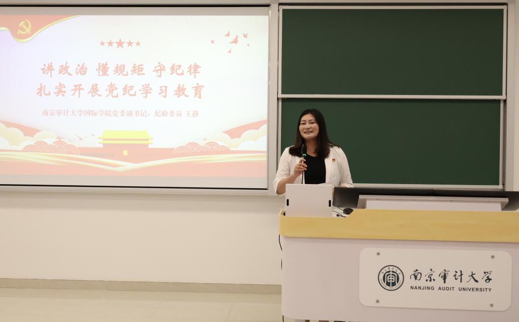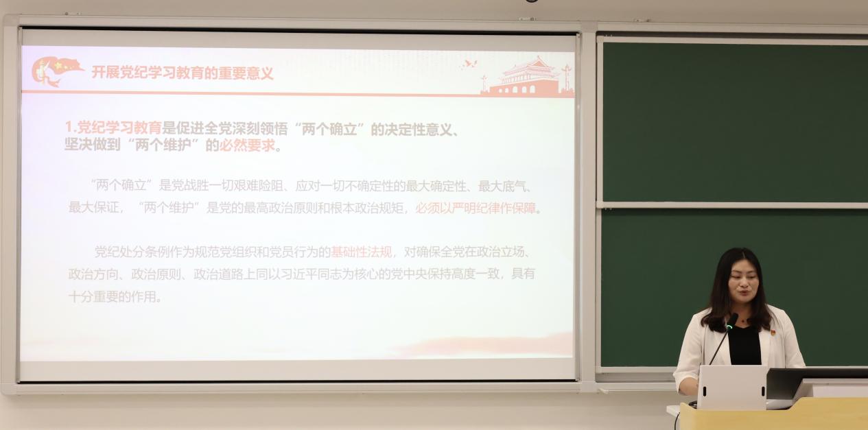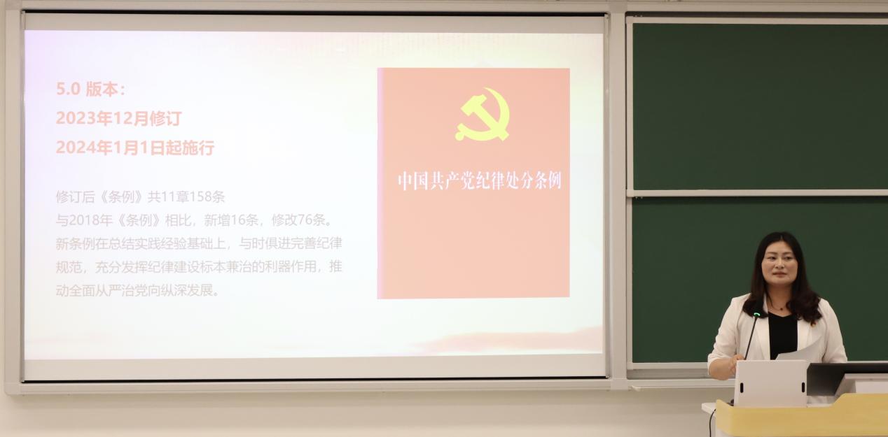 接着,王静带领党员同学们回顾《中国共产党纪律处分条例》的修订历程。她重点阐述了现行的第五版《条例》的五大鲜明特征——严明政治纪律和政治规矩、加强全方位管理和监督、引导激励干部担当作为、坚持党性党风党纪一起抓、坚持挺纪在前、纪法有机衔接、有效贯通。她总结指出,新修订的《条例》,纪律要求的红线和纪律处分的标尺更加清晰,贯穿和凝练了党的创新理论成果蕴含的立场方法,进一步完善了纪律处分运用的原则、理念和方法,为纪律执行提供了有力有效的指导和规范可靠的依据,为纵深推进新时代全面从严治党提供了坚强纪律保障。